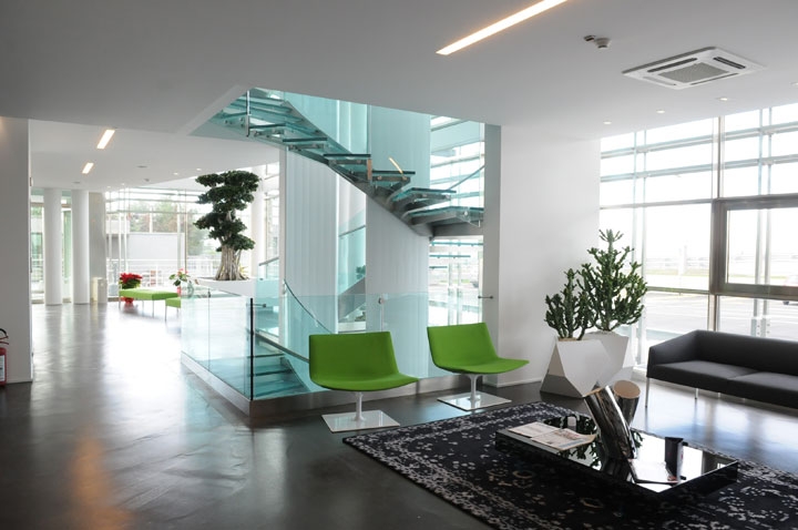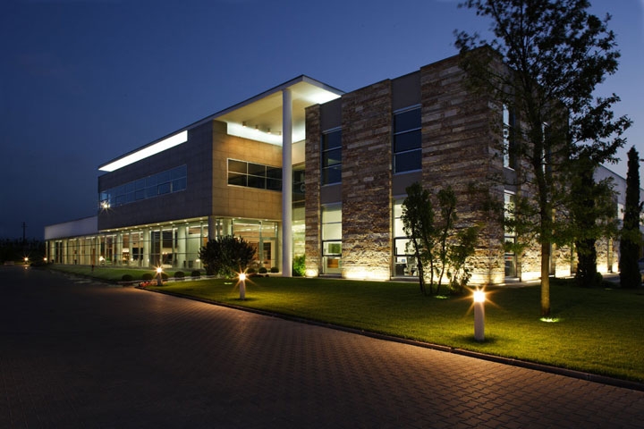 Il progetto architettonico dello showroom si contraddistingue per la riuscita composizione delle facciate, con pareti cieche e superfici vetrate che si sovrappongono e si alternano con gradevole equilibrio. La grande vetrata-vetrina garantisce all’esposizione, luce naturale di giorno e ottima visibilità dei prodotti di sera, mentre i confini tra esterno e interno si annullano grazie al rivestimento in pietra del corpo uffici che si estende all’interno.