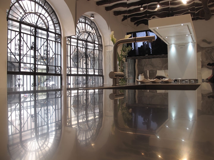 L’idea di creare uno spazio aperto e fluido, ha dato vita ad un percorso espositivo chiaro e semplice caratterizzato da un perfetto equilibrio tra le zone di percorso e le diversi aree merceologiche. Il pavimento in cemento grigio, le pareti e i soffitti di colore bianco, hanno l’intento di ottenere un involucro neutro, pulito, essenziale, un contenitore in cui il prodotto è l’unico protagonista dello showroom. La trasparenza del cristallo e la lucentezza dell’acciaio, invece, subentrano per donare, un’impronta moderna e convincente.
