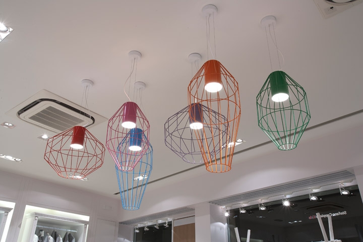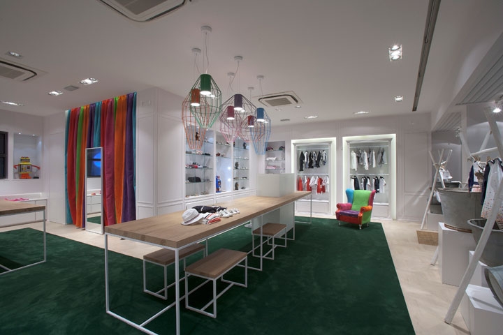 Lo store, dedicato all’abbigliamento per bambino, è contraddistinto dalla sequenza di scaffali di disegno classico, semincassati e retroilluminati a led. Il bianco degli arredi, dei soffitti e delle pareti, viene abbracciato da una brillante palette di colori utilizzata sui tendaggi, sulle poltrone e sulle lampade a sospensione, realizzate su disegno. Domina la scena il maxi bancone in massello di rovere spazzolato.