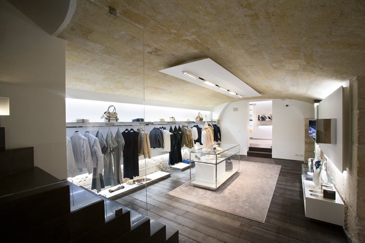 La tradizione tende la mano all’innovazione: questa è l’ispirazione per il rinnovamento della prestigiosa boutique di Altamura. In un imponente contesto architettonico di muri e colonne in pietra, volte affrescate o in tufo a vista, si inseriscono, con discrezione, arredi e complementi in cui legno bianco lucido, acciaio e cristallo trasparente si intrecciano costantemente e sapientemente. Ingegnose le boiserie a specchio che, nell’ingresso e nel reparto calzature, nascondono dietro di sé porte e armadi contenitori.