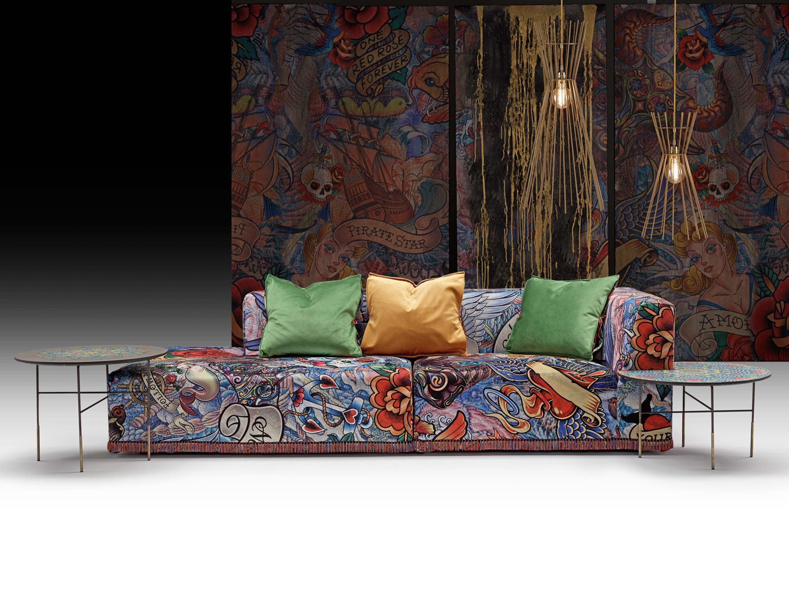 Divano modulare rivestito con un tessuto dalla forte impronta grafica e artistica, disegnato da Giovanni Pesce e cucito da abili mani artigiane.