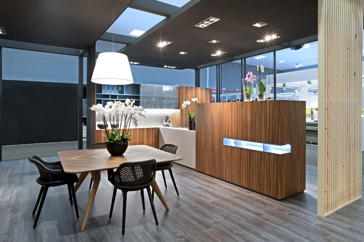 Per il Salone del Mobile 2015 è stato progettato uno spazio in cui si susseguono, in maniera armoniosa, diverse stanze espositive per le varie tipologie di prodotto esposto. Quinte traforate in legno dividono e schermano senza mai impedire la vista al visitatore, carte da parati e finiture a cemento decorano, invece, superfici interne ed esterne, verticali e orizzontali. La luce cade dal soffitto con fari direzionali incassati e proiettori teatrali.