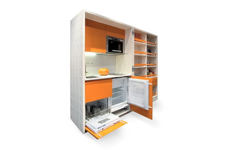 Il concetto di cucina compatta viene rivoluzionato dal progetto cooking box, una scatola chiusa che nasconde al suo interno un’eccezionale varietà di attrezzature e soluzioni compositive. Si tratta di un monoblocco singolo e indipendente, ideale per i piccoli spazi, formato da una parte fissa a profondità 64,5 cm che può ospitare piano cottura, lavello, forno, frigo, lavastoviglie, e da una parte apribile (su ruota) a profondità 32,5 cm che contiene la dispensa e anche un tavolo ribaltabile. Il cooking box è predisposto per il collegamento degli elettrodomestici sia alla rete idrica che alla rete elettrica.