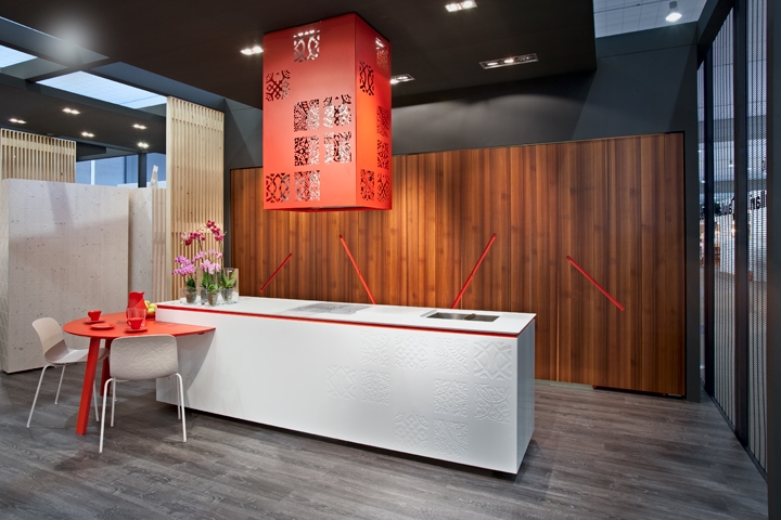 Padiglione ad isola per l’esposizione alla Fiera del Levante 2012 : l’ambiente aperto sui quattro lati ha dettato le linee guida per la progettazione dello stesso. Pareti e volumi pieni ridotti all’essenziale, quinte a tutt’altezza in rete metallica traforata per schermare, dividere, senza mai occludere la vista ai visitatori. Tonalità di grigio scuro per la struttura a telaio, i plafoni, la pavimentazione, illuminazione puntuale e discreta con fari alogeni incassati a filo. A travolgere questo rigore l’estro, i colori, i materiali e le composizioni dei prodotti presentati.