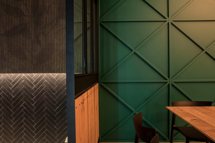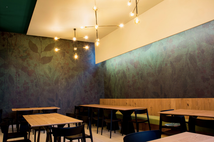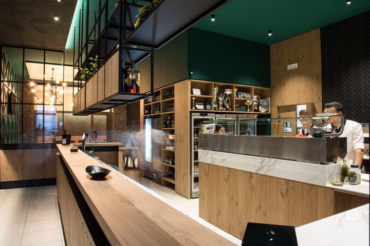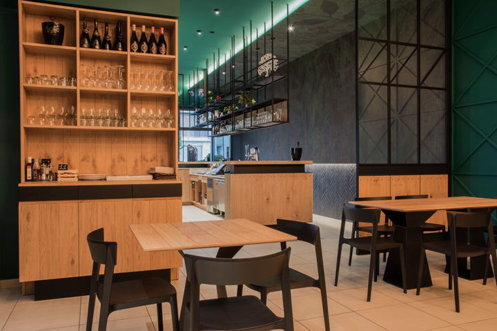 Il Vecchio Ponte pizzeria, ad Altamura, ritrova un’immagine nuova, fresca, e di tendenza, attraverso un progetto di relooking che nasce per rinnovare gli spazi e renderli più accoglienti e funzionali. Il verde smeraldo delle pareti, la carta da parati e un’ampia boiserie dal gusto industriale, dominano lo spazio e creano un’atmosfera piacevole e rilassante. A questi toni si accostano il rovere nodato e il ferro nero, degli arredi. Grande importanza è stata data al banco all’ingresso, con una lunghezza di 6 m che segna il percorso verso le sale ristoro. Non meno importante è l’attenzione posta per il comfort acustico degli ambienti, attraverso un preliminare studio dell’acustica del locale e un successivo intervento di insonorizzazione integrato a soffitto. Il progetto ha riguardato anche il disegno di tutti gli arredi, compresi i tavoli, le panche e le lampade.