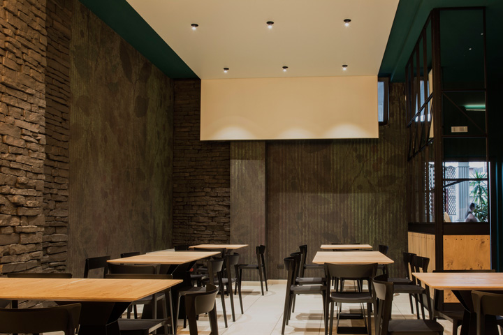 Il design ricercato e raffinato si esprime in ognuno degli elementi che compongono l'arredo, dalle panche a muro ai tavoli, dal bancone del bar al mobile passavivande, dalle lampade alle carte da parati, il tutto realizzato su disegno. L'imponente cucina a vista è separata dalla sala da una grande vetrata con struttura in ferro e pannelli in vetro cannettato, mentre il legno di olmo è stato scelto per la realizzazione dei tavoli, delle panche, delle pareti attrezzate, dei mobili contenitori.