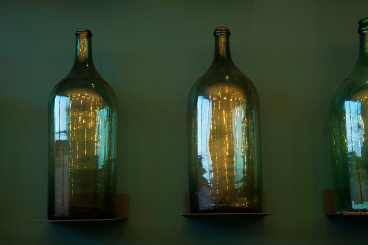 Tutti gli arredi, dai tavoli, alle panche, alle poltrone, al mobile bar, agli elementi decorativi, alle lampade, sono stati rigorosamente realizzati su disegno da artigiani locali.