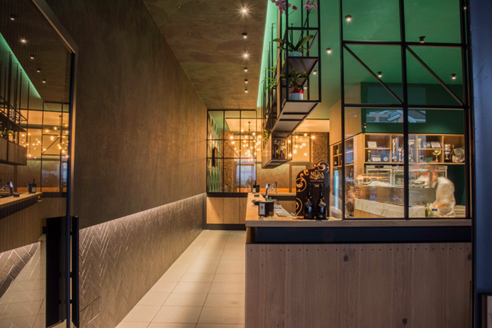 Situato ad Altamura, a ridosso delle mura megalitiche della città, Cibarte è una location dove cibo e arte si esprimono in un unico e nuovo linguaggio. Il protagonista dell’ambiente è la decorazione che trova la massima espressione in un ampio controsoffitto rivestito con una carta da parati realizzata su disegno, di forte impatto emotivo. La stessa grafica è stata adottata sulla parete e sui tavolini della zona lounge, corredata da comode poltrone in velluto verde che rendendo l’ambiente giovane,di tendenza e conviviale per la degustazione di un ottimo bicchiere di vino. Il metallo in finitura oro di mensole, scaffali ed elementi decorativi si contrappone cromaticamente alle superfici materiche delle pareti rivestite in rovere nodato silver e del parquet in rovere cerato.