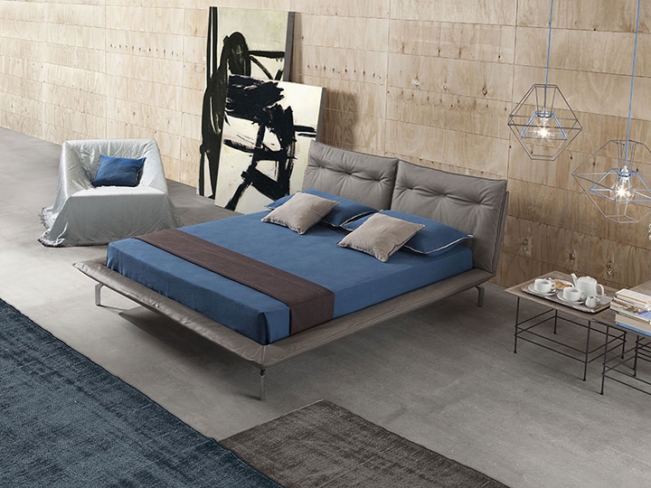 Letto dal design raffinato costituito da una struttura sgusciata sorretta da esili piedini in acciaio, che gli conferiscono un grande senso di leggerezza. Il morbido rivestimento in pelle del giroletto e della testata, corredata da grandi cuscini, offrono un confort assoluto.